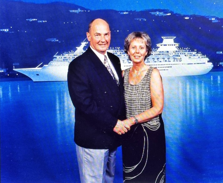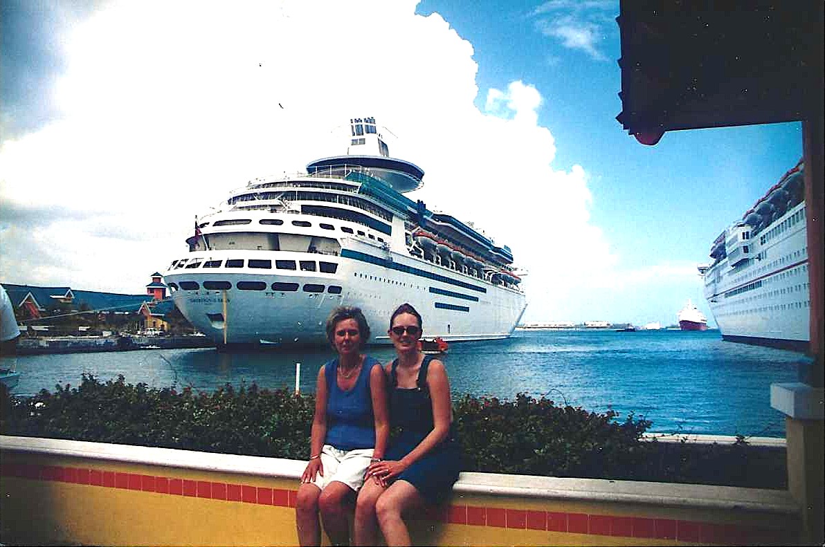 Här vid kaj i Nassau Bahamas min fru Ing-Britt och vår dotter Cecilia som arbetade som sjuksköterska på kryssningsfartyget i bakgrunden.
